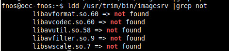 使用 ldd 检查 imagesrv 相关依赖时,发现缺少 FFmpeg 相关动态库: